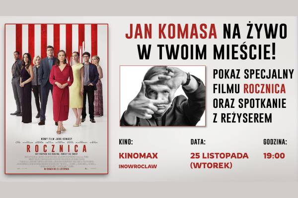Z okazji 10-lecia Dyskusyjnego Klubu Filmowego KINOMAX Inowrocław zaprasza na pokaz specjalny filmu „ROCZNICA” z udziałem reżysera Jana Komasy („Sala samobójców”, „Miasto 44”, „Boże Ciało”). Po seansie zapraszamy na spotkanie z reżyserem!
